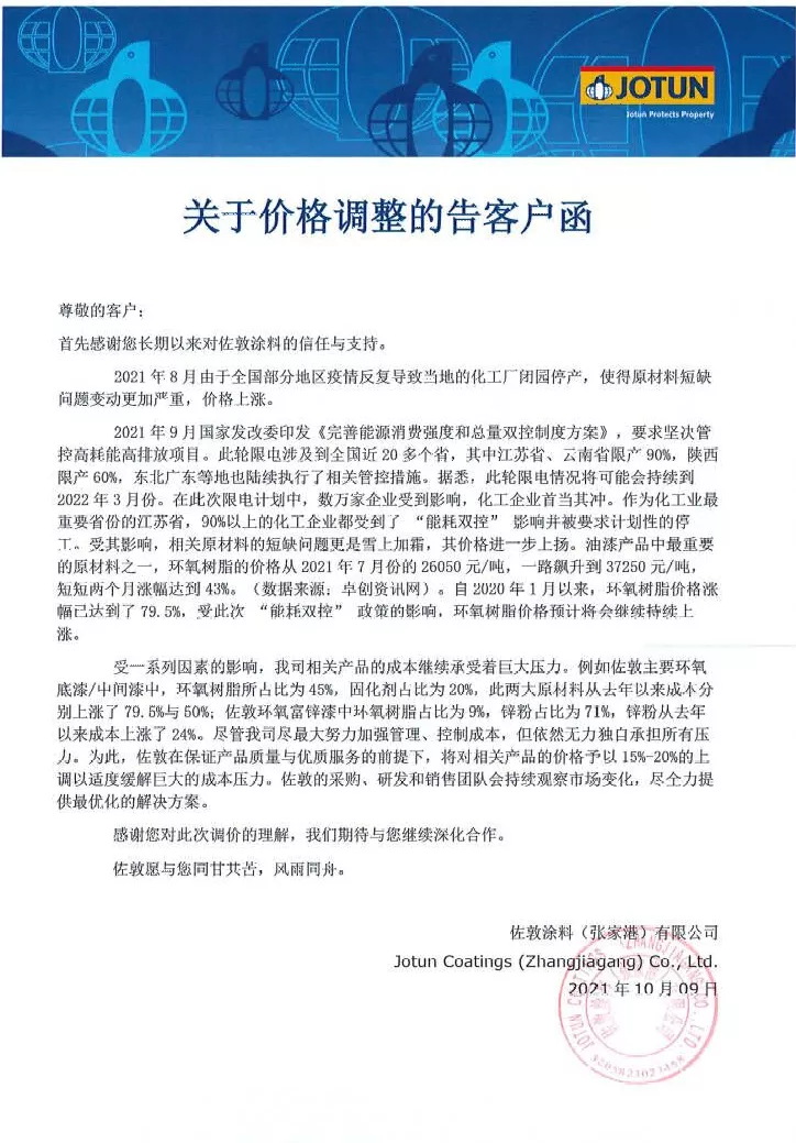 受一系列因素的影響,我司相關(guān)產(chǎn)品的成本繼續(xù)承受著巨大壓力。例如佐敦主要環(huán)氧底漆/中間漆中,環(huán)氧樹脂所占比為45%,固化劑占比為20%,此兩大原材料從去年以來(lái)成本分別上漲了79.5%與50%;佐敦環(huán)氧富鋅漆中環(huán)氧樹脂占比為9%,鋅粉占比為71%,鋅粉從去年以來(lái)成本上漲了24%。盡管我司盡最大努力加強(qiáng)管理、控制成本,但依然無(wú)力獨(dú)自承擔(dān)所有壓力。為此,佐敦在保證產(chǎn)品質(zhì)量與優(yōu)質(zhì)服務(wù)的前提下,將對(duì)相關(guān)產(chǎn)品的價(jià)格予以15%-20%的上調(diào)以適度緩解巨大的成本壓力。佐敦的采購(gòu)、研發(fā)和銷售團(tuán)隊(duì)會(huì)持續(xù)觀察市場(chǎng)變化,盡全力提供最優(yōu)化的解決方案。
